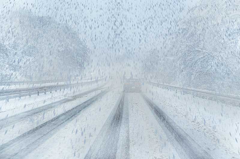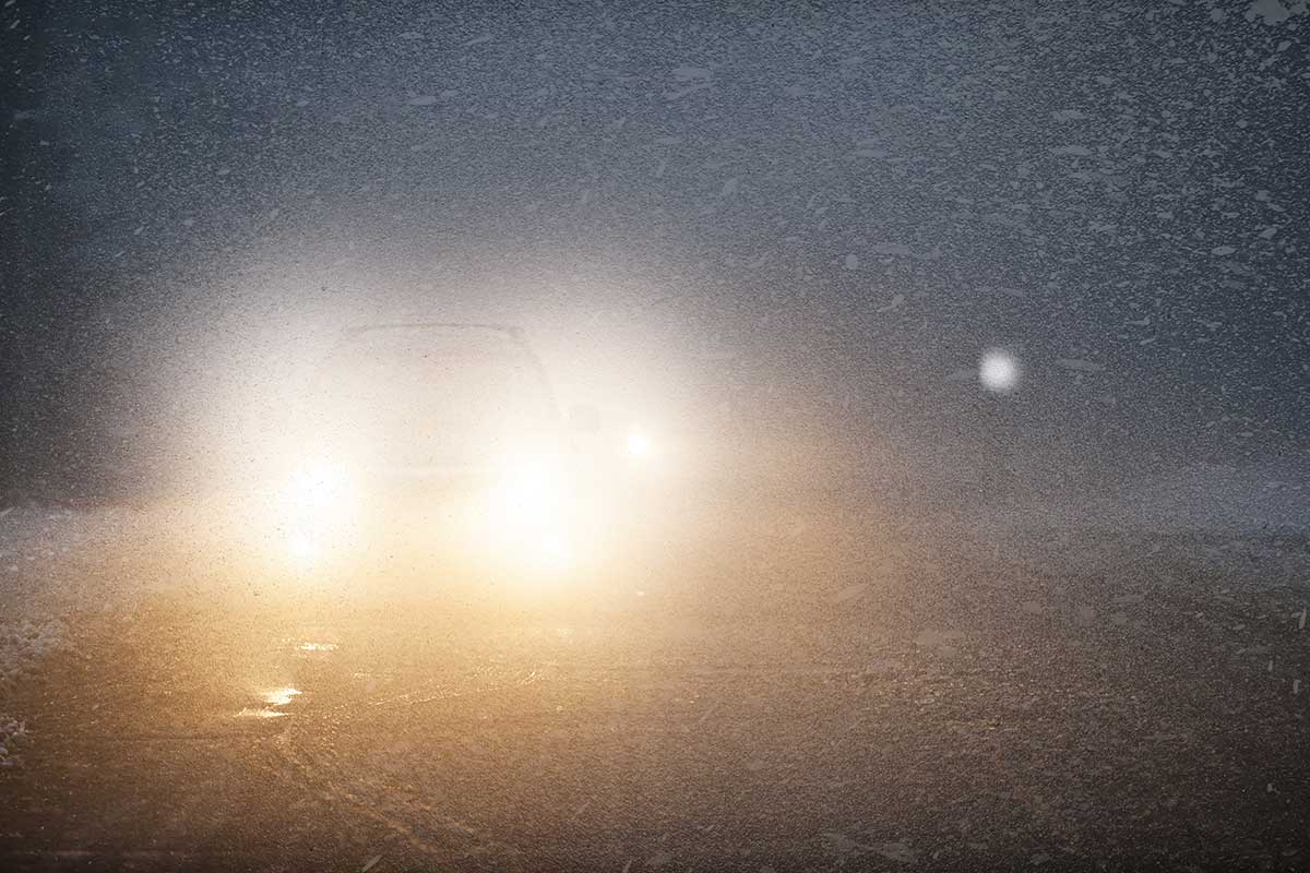 Snow and rain reduce visibility and can obscure pedestrian form or roadway edges.